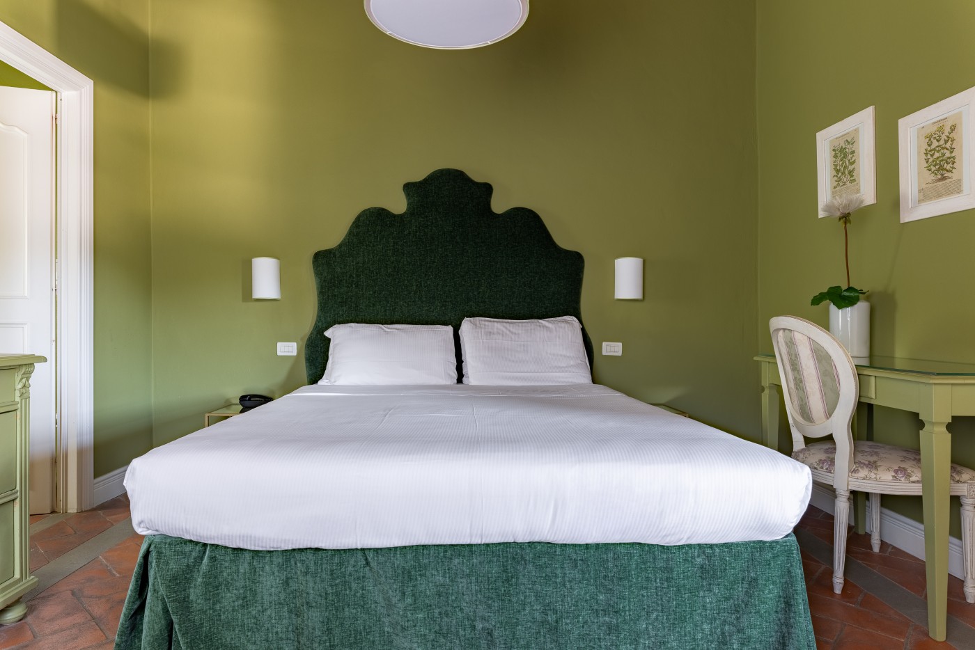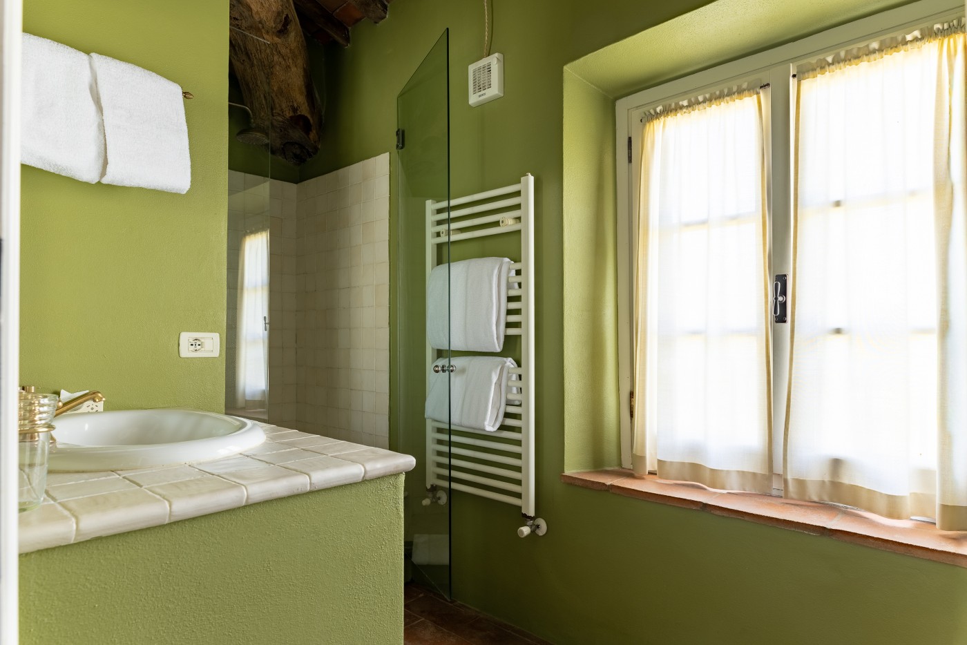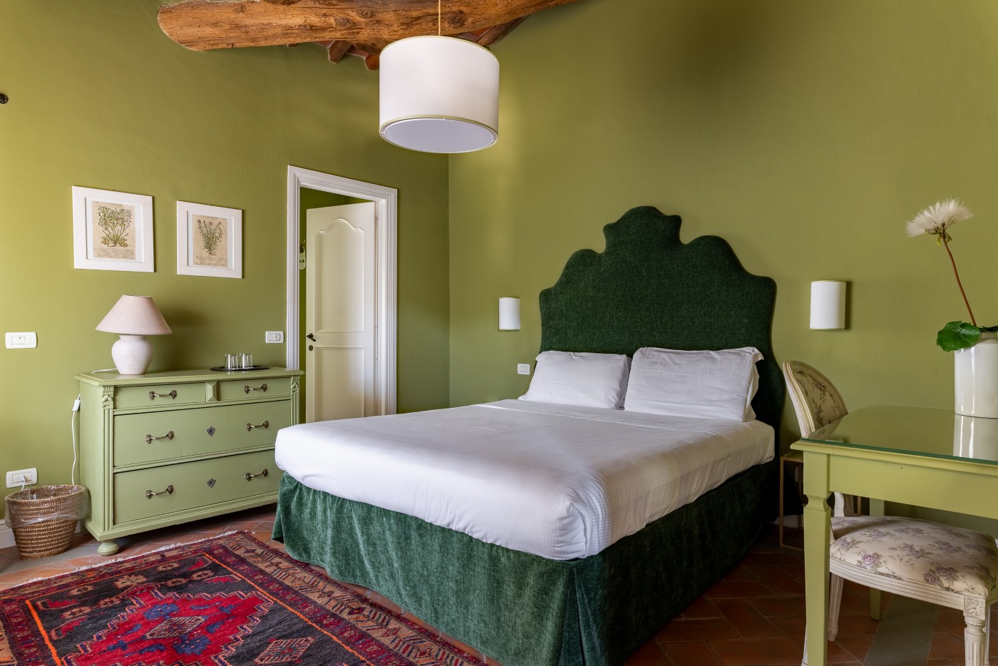 Soffitti con travi e mezzane a vista, tipici pavimenti toscani in cotto, eleganti tessuti