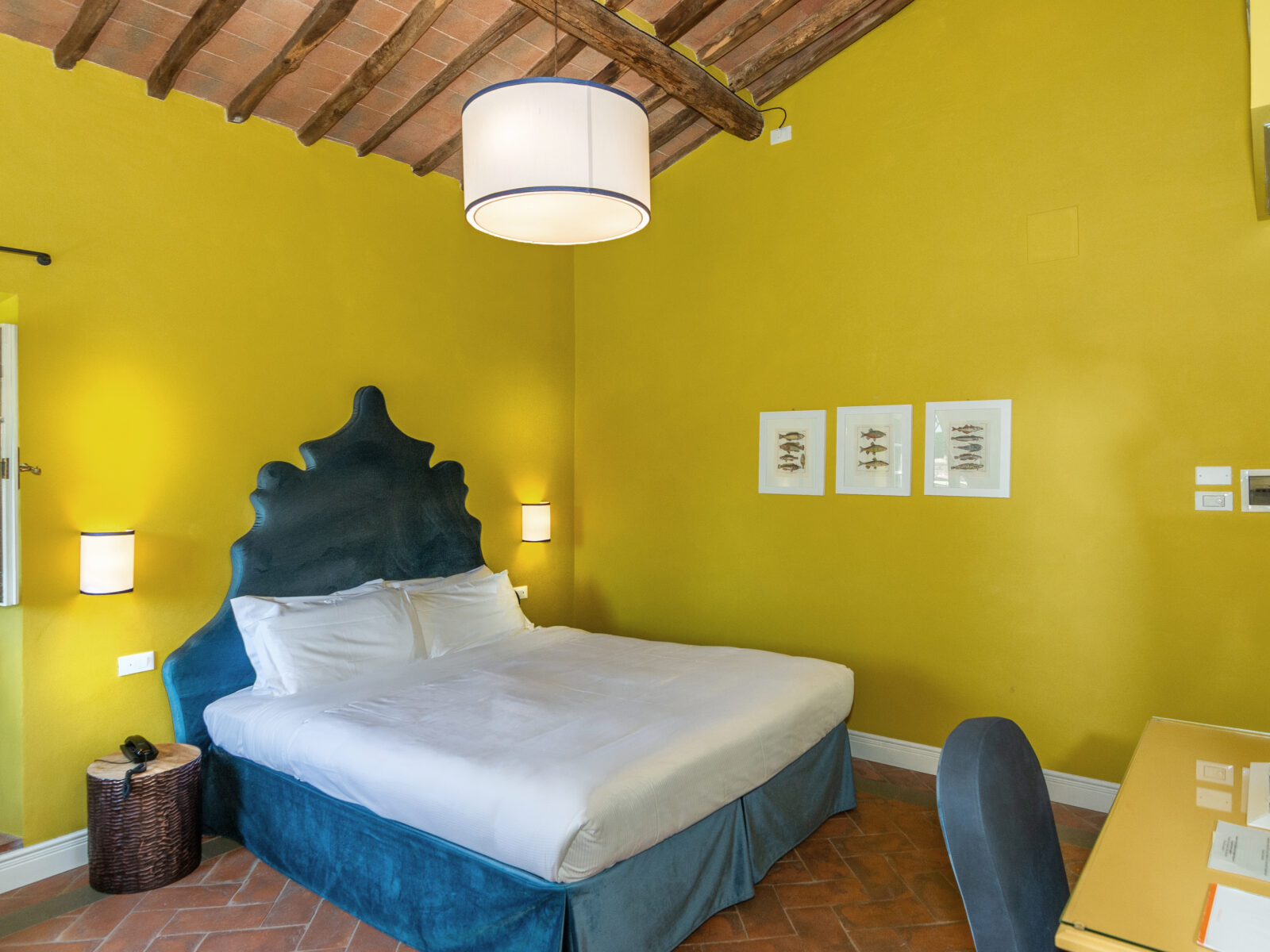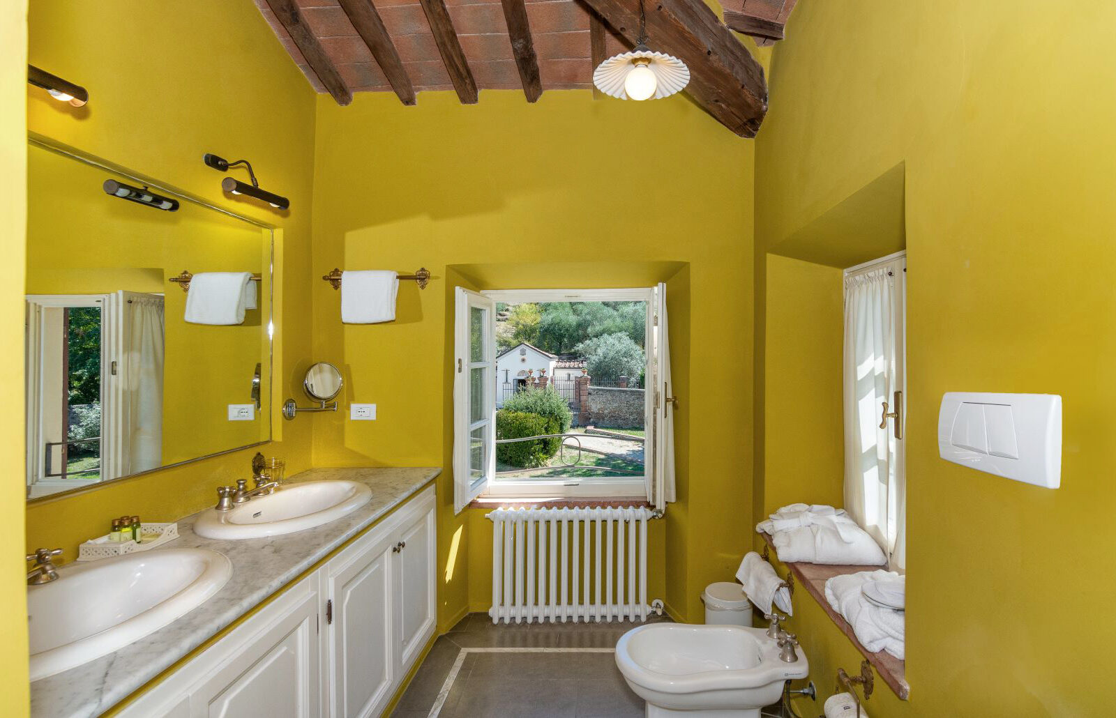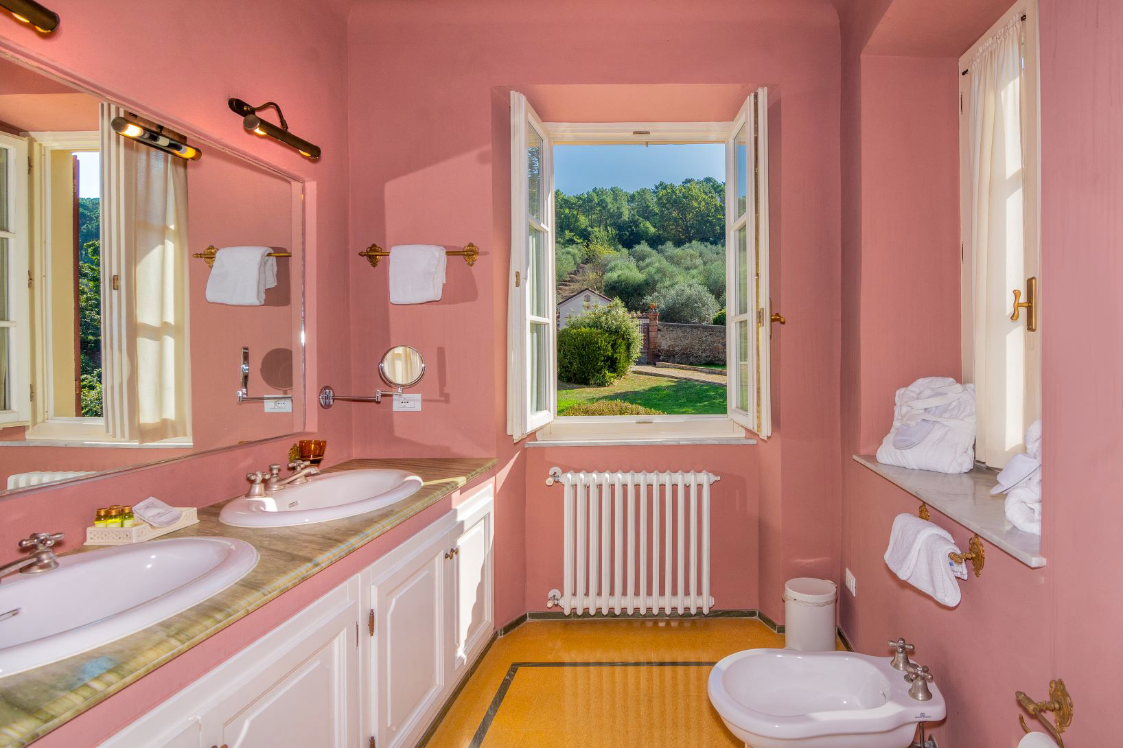 L’altra vanta colore predominante rosa, l’elegante pavimento Tessieri e un affresco originale sul soffitto, calda e luminosa con tappezzeria dai toni chiari e dorati. Entrambe hanno un bagno con vista.