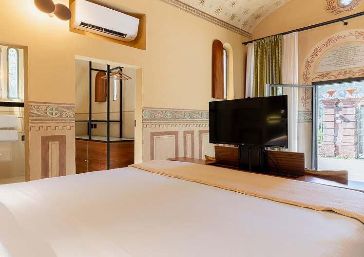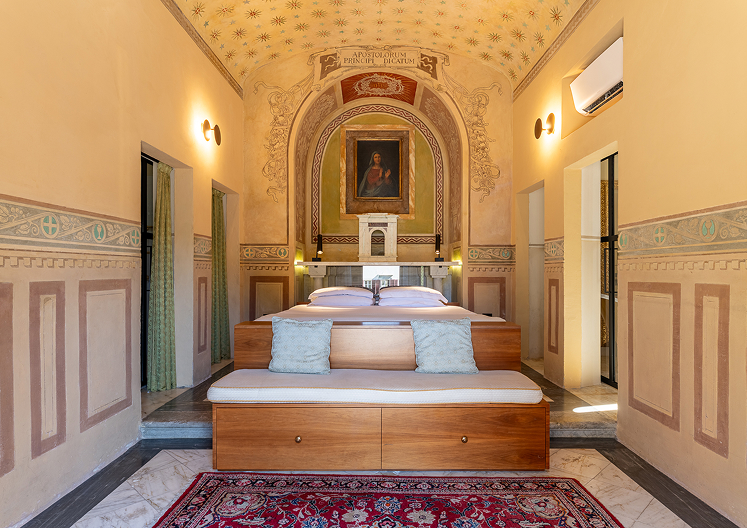 La navata centrale è stata volutamente mantenuta allo stato originale, con decorazioni fatte a mano in basso rilievo sulle pareti laterali e meravigliosi affreschi sul soffitto a volta. La struttura del grande letto è stata realizzata a mano da un falegname locale come del resto tutti gli altri arredi al suo interno.