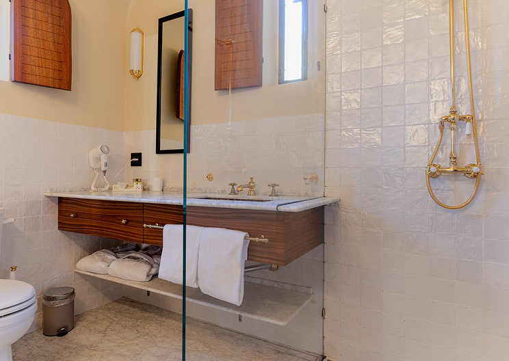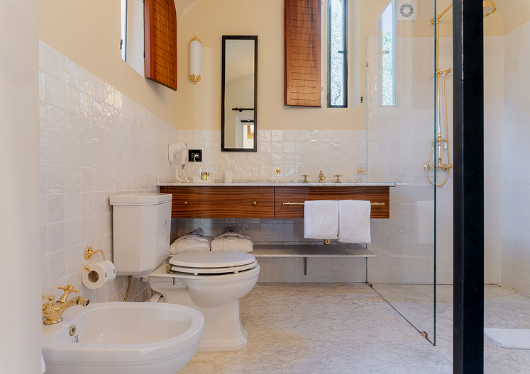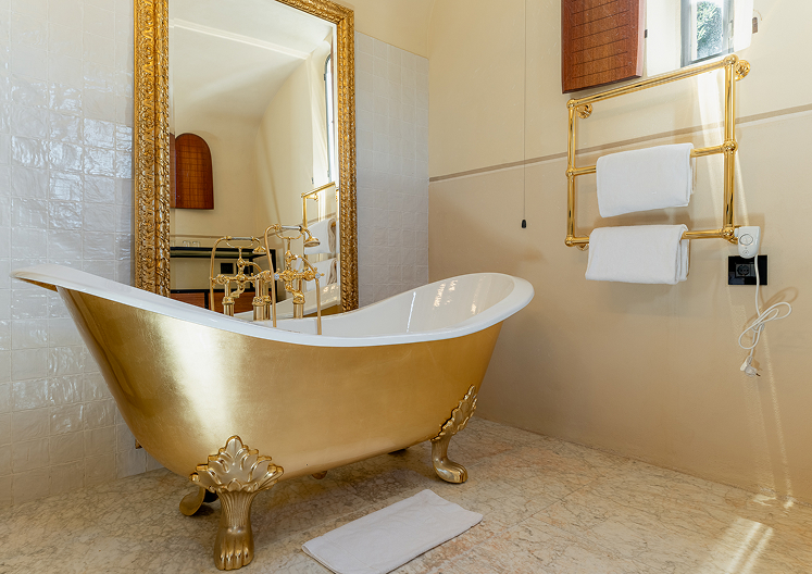 Le nicchie laterali, pavimentate con marmo di Carrara, ospitano un bagno con finiture in oro davvero molto esclusivo. La vasca in stile barocco, anch’essa dorata, conferisce all’ambiente un tocco di sfarzosità ed eleganza.